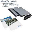 Create professional report covers quickly with our Agility covers. They feature a side-staple, wrap-around style that keeps them looking brand new, even after multiple uses. The front cover is a 7mil clear matte and the spine and back cover is an 80lb. classic linen available in black, white, or navy blue. Bind small presentations of all kinds up to 15 sheets of copy paper in only a few seconds per document with Agility report covers.